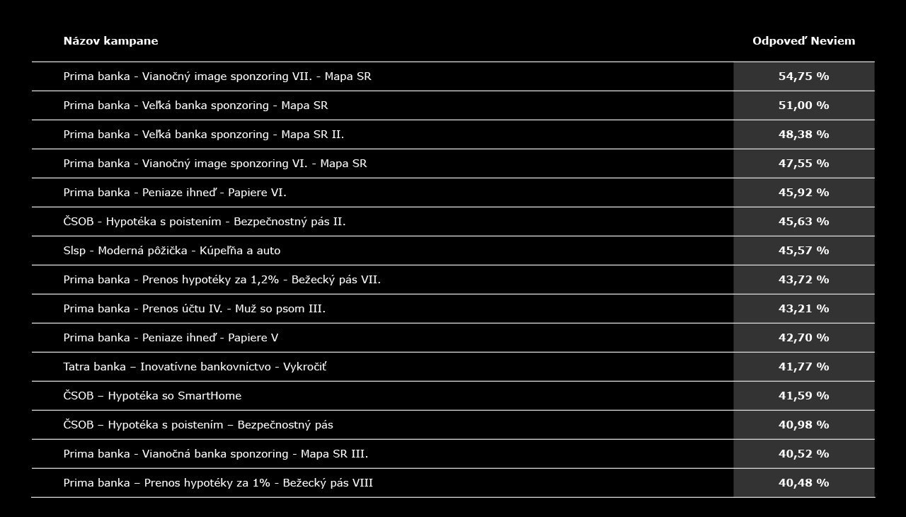Z nich vyšlo, že reklamy Prima banky excelujú v šedom priemere. V rebríčku bankových reklám, ktoré v ľuďoch zanechali nula celá nula emócií, obsadili až desať z pätnástich priečok.