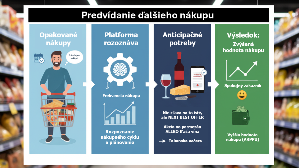 Zákazník si každé dva týždne kupuje balenie cestovín a paradajkovú omáčku. Platforma rozpozná tento nákupný cyklus. Týždeň po nákupe, keď je pravdepodobné, že začína plánovať ďalšiu taliansku večeru, mu systém automaticky neponúka zľavu na to isté, ale vypočíta "next best offer" (najlepšiu budúcu ponuku). V tomto prípade to môže byť akcia na strúhaný parmezán alebo fľašu vína, ktorá sa hodí k danému jedlu. Technológia tak anticipuje budúcu potrebu namiesto toho, aby len reagovala na minulé správanie.